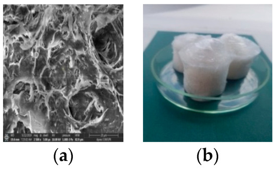 (a) SEM image of cellulose fiber coated with PEG-based monomers and (b) image of cellulose foams.