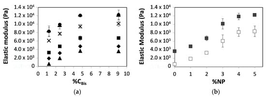 Next, we show hydrogel elastic modulus as a function of %CBis, relative concentration of the crosslinker Bis (Table 2), which is defined by Equation (1):