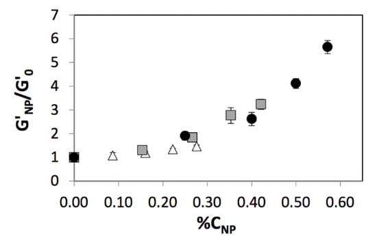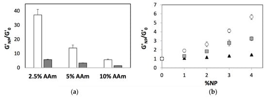 Interestingly, we also observed decreasing role of nanoparticles with increasing monomer concentrations. To better understand this observation, we defined a new variable (%CNP) that refers to the concentration of SiNPs relative to the monomer concentration in a manner similar to %CBis (Equation (2)).