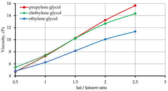 The effect of the addition of different solvents to the original sol on the ink viscosity was investigated (Figure 4).