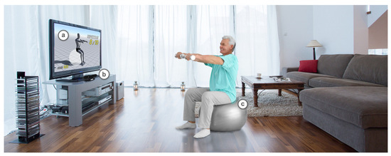 Graphical representation of home environment where patient performs rehabilitation exercises: (a) Home TV connected to the device. (b) Autonomous device tracking patient skeleton. (c) Patient playing exergame.