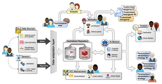 Figure 2 graphically shows the general architecture proposed for precision rehabilitation. This architecture is composed of a series of modules that contemplate functionality from different perspectives: (i) collecting and processing data from multiple sources, (ii) intelligent data analysis for the definition of rehabilitation routines, (iii) integration of human–computer interaction mechanisms, (iv) motivation of patients to increase their level of commitment with the rehabilitation process, and (v) analytics and information visualization so that medical personnel can adequately monitor the rehabilitation.
