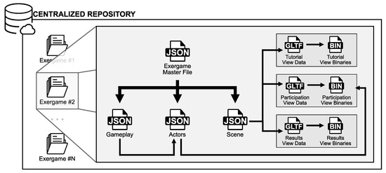 In the case of scenes, a file is kept in the JSON format that references each of the three views that make up the exergame. Thus, each view is defined by a specification file in the GL Transmission Format (glTF) [17] maintained in a JSON structure that includes, in a self-contained way, all the resources of a scene internally encoded using URIs of base-64 data (i.e., a unique .gltf file) or externally referenced (i.e., a .gltf file and another .bin).