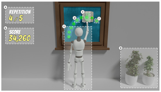 Figure 4 shows an example of a possible exergame in which the patient is invited to clean a window by replicating the established movement by the actors of the game mechanics. In the screenshot, the exergame would find itself executing the view in which the patient directly participates in the repetition, specifically in (a) the fourth of a total of five assigned. (b) Obtained score is shown in this case during the participation view without the patient having to wait to complete the exergame and progress to the results view. (c) The avatar would replicate movements made by the patient by means of direct association between patient’s joints and 3D virtual avatar. By highlighting the joints involved in the movement, that is, (e) the avatar’s right hand in green, the patient is informed that the movement must be carried out with that hand and (d) that the interaction must be made with actors of the color that establishes the game mechanics in the defined order. (f) Those actors of the game mechanics surrounded by an orange circle would indicate to the patient that they have not yet interacted with them. Finally, (g) the scene view also defines some decorative and continuously animated elements.