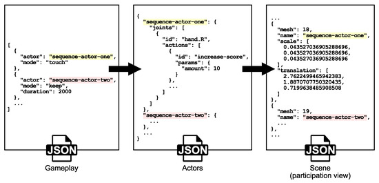 It should be noted that information in this JSON file is declared in the form of a list with the aim of maintaining the order in which the patient must interact with actors. In the case of the file that defines actor behavior, actor sequence-actor-1 would indicate the list of joints to which one would react and the actions that would take for that reaction. In this case, the joint associated with the right hand executes the action of increasing the score (i.e., increase-score) in the amount indicated by the properties of the object params. Finally, the file that defines the scene (in the case of the figure, participation view) would maintain the hierarchy of the elements that form the scene in glTF format, indicating properties such as the transformation of objects (i.e., translation, rotation, and scale), the associated animations, or references to binary data.