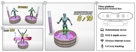 Screenshots of developed exergame from devised functionality in gamification module: (a) Tutorial view. (b) Results view. (c) Participation view. (d) Autonomous device TVico.