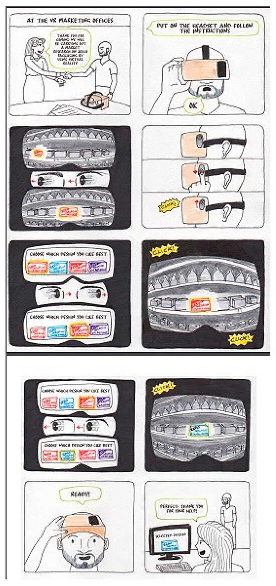 The storyboard shows a market research event in which, instead of using a real product, a virtual reality headset is used. The main goal of this is to provide more options of products and environments to improve the participants experience during the evaluation.