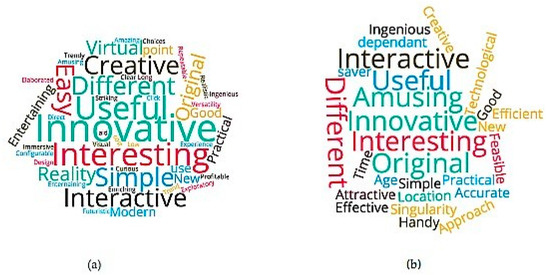 The survey participants distribution is explained in Table 3. Results from both areas were separated to compare both opinions. In the survey, each participant had to provide three words to describe the idea. The corresponding word clouds are presented in Figure 4: (a) Computer Science students and (b) Marketing professors. Innovative, Interesting, Interactive and Useful were the most repeated words for both populations.