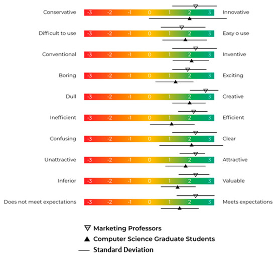 On the other hand, Hedonic Quality—Identity (HQ-I) indicates the level of identification of the user with the prototype and obtained a score of 1.16, which is considered acceptable. The Hedonic Quality—Stimulus (HQ-S), which measures whether the experience is original, interesting and stimulating, obtained a score of 1.76, the second highest. Attractiveness (ATT), which indicates how attractive the product is to the user, scored 1.94, the highest classification among the categories.