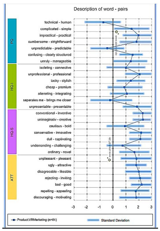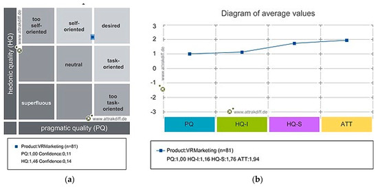The diagram of average values of the AttrakDiff dimensions for the Virtual Reality prototype are plotted in Figure 7b. The diagram distributes the mean values assigned by the participants in the dimensions Pragmatic Quality (PQ), Hedonic Quality—Identity (HQ-I), Hedonic Quality—Stimulation (HQ-S) and Attractiveness (ATT).