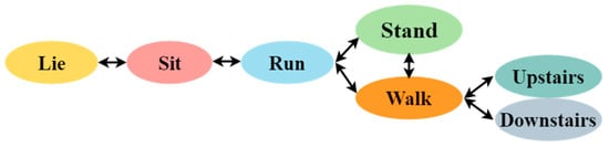 The current approach addresses the processing of mobile sensor information in order to recognize user activities and their associated states in specific HAR domains. So, it is necessary to define a set of basic concepts that can be used through the different stages or classification processes that characterize human activity recognition. The first concept of interest is the so-called user state, which represents those features that can be associated with the actions or physical activities performed by individuals. Table 1 shows a list of common user states along with a short description and a label that identifies every state. These user states can represent static features (e.g., sitting or lying) or dynamic actions such as running or going upstairs. State transitions are shown in Figure 1 as a graph displaying the potential connection among the considered user states.