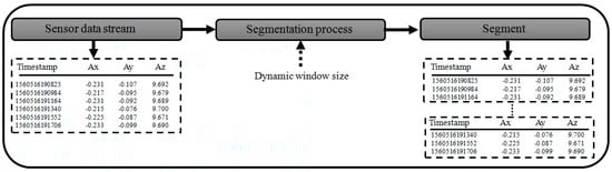 Activity recognition systems involve several types of sensors to obtain streams of data that can be used in order to classify user’s activities and determine their associated user states. In this sense, the sensor stream may be segmented into several data windows to improve their processing. Such windows can be static or have dynamic sizes (measured in time units) and they may also overlap sensor samples when time is passing or “slides”. This concept of a sliding window is widely employed in HAR processes, and several ranges of window sizes can be used. Windowing techniques have shown their effectiveness for the recognition of static as well as dynamic human activities [24]. In the current work, a time-based windowing method is used to segment the data gathered from an accelerometer sensor into time windows. This method merges sensor data that are collected during a specific time interval. Instead of defining a fixed length of static windows, it is possible to dynamically adjust the window size. Figure 2 shows a schema of such a windowing mechanism.
