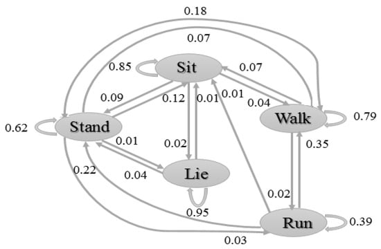 where comprises the total amount of semantic activity inferences till an instant t and is the number of times the semantic activity inference j has appeared during the interval in which is computed. The use of statistical-based techniques combined with semantic classification methods may lead to different activity inferences (user states). Hence, a transition probability matrix (TPM) [25] is applied to refine statistical activity inference through the probability of transition occurrence in human activities. A TPM is generated by evaluating the activity decisions taken in the previous time interval by a classifier algorithm. Figure 3 shows a graphical representation called the transitional probability graph (TPG) of an example of TPM that displays the transitional probabilities of different user’s activities. Using the TPM information, it is possible to infer the final user state from the available current statistical and semantic activity labels by tracing the probabilities of transition from the previous inferred activity label which occurred at to each available current activity state performed at time .