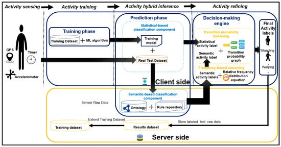 Based on the previous concepts, a framework called sensor-based human activity recognition (SHAR) is proposed, combining data and knowledge-driven methods to recognize human physical activities. SHAR allows handling the classification uncertainty and improving the accuracy of recognition processes by reducing the considerable amount of training data coming from several sensor sources along with using semantic inferences. Figure 4 shows an architecture overview of the SHAR framework that is divided in the next components: (i) Activity Sensing, (ii) Activity Training, (iii) Activity Inference, and (iv) Activity Refining. These components are organized according to versatile client-server architecture in the sense they can be allocated either on the client side (e.g., a smartphone) or using a server environment depending on the timing or context-aware requirements. First, the Activity Sensing component is used for gathering data from inertial and motion sensors embedded on smartphones or wearable devices during user activity such as movements, posture changes or gestures. This component adopts the sliding window mechanism described before in order to achieve a trade-off between recognition responsiveness and the accuracy required according to user circumstances and their surrounding environment. It also has to take into account the usage of computational resources and the energy consumed during this sensing phase. In this sense, different ranges of window sizes can be considered to obtain suitable timing responses.