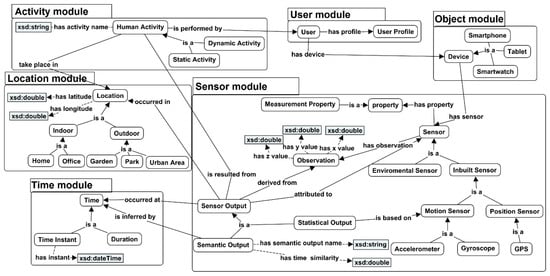 The SHAR framework relies on a HAR ontology called Modular Activity Recognition Ontology (MAROlogy) and it is usually accessed by means of server-side RESTful Web services. However, it is also possible to have a client-side version of MAROlogy containing a minimal set of rules in case the server was not accessible. The MAROlogy model is described in terms of interrelated modules representing different concepts related to the physical activity, user state, sensor devices, location, time, or objects. Figure 5 shows an abstract overview of the MAROlogy model divided into its ontology modules and including their general relationships. Table 2 shows a short description of these basic ontology modules.