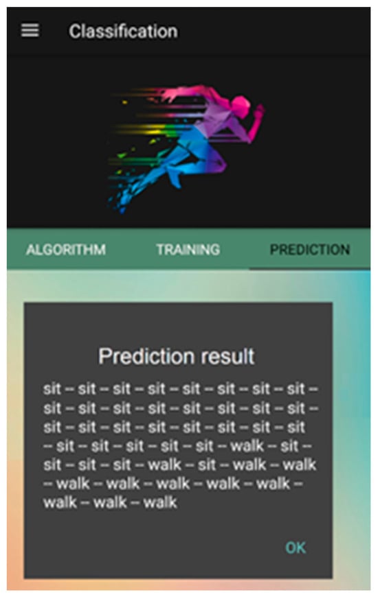To assess the accuracy of activity state prediction, the first scenario, in which a simple “sit-to-stand” transition occurs, is considered. Figure 8 shows a screenshot of the ARApp application that displays a test where the detected user states are distorted. The screenshot displays a sequence of “walk” labels after a “sit” state when classic ML algorithms are applied. Instead, a “stand” state should be detected, and such a distortion produced by the data-driven classification algorithms can be mitigated with the use of the proposed hybrid approach. So, the semantic-based classification, which uses ontology knowledge and reasoning rules, suggests that the current user activity is “sitting” or “stand” using the transition-aware rule based on the previous activity carried out by the user. Regardless of the acquired semantic prediction results, the classification process exploits the time-aware rule and puts forward a new suggestion, arguing that current user activity is equivalent to standing activity by measuring the time similarity between these two activities and checking such a similarity under a given threshold. Next, in order to overcome the high label imbalance at the level of the semantic classification, an activity frequency distribution is obtained to weight the occurrence of different semantic activity outputs. These mechanisms select the “stand” state as the optimal semantic activity inference for such a scenario. The detection of the more appropriate activity state from both kinds of classification processes exploits the transition probabilities graph (TPG) depicted in Figure 3. This graph shows that the probability of the “sit-to-stand” transition is approximately 0.09, while the probability of sit-to-walk is equivalent to 0.04. The definitive activity inference using the refined approach in the first scenario case is a “sit-to-stand” transition. So, this example shows the refinement effectiveness, reducing classification distortion caused by the preceding data-driven approach [29] and allowing for better accuracy in the prediction of activity states.