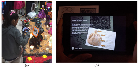 Augmented reality prototype’s functionality: (a) A user is focusing a tag attached to an altar’s element; (b) Narrative and image presented for the element selected.