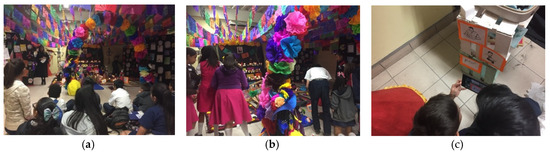 - Condition A: Listening to the teacher’s explanation of the altar’s elements. This is the usual method used in schools. As illustrated in Figure 2a, the teacher explains to the group of students the altars’ meaning and whom the person commemorated is.