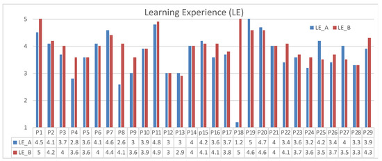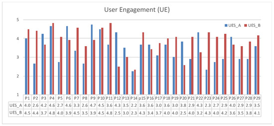 Participants were 14 men and 15 women aged 11 to 13 years (M = 11.68; SD = 0.54). Twelve (12/29) of them stated that they knew what AR is, and five of them reported using AR in video games. Figure 3 and Figure 4 show, respectively, the participants’ responses to the learning experience (LE) and user engagement (UES) instruments for each condition (A and B).