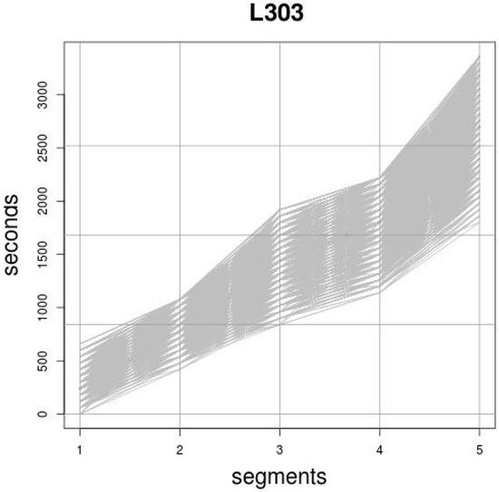 Figure 1 shows a graphical representation of a set of TT records for a given route in which five stops, that is four segments, have been selected. The stops are represented on the horizontal axis. On the vertical axis, the TT is observed, and each grey graph is the representation of one of the routes of the line.