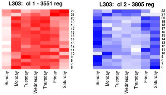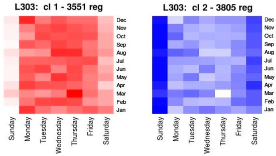 This phase produced two results. On the one hand, the generated TT patterns, determined by their representative elements, that were centroids, and on the other hand, the start instant (date and time of day) of the expeditions belonging to the same cluster. To represent this second result intelligibly, the technique was the Heatmaps Graph. This technique allows, using color palettes, the values contained in an array to be shown. In this case, in which the goal is to analyze the new information contained in the records included in each cluster, the matrix was determined by the proportion of records contained in certain time intervals related to the month, week day, and the time of day. The color palette selected to represent each cluster goes from white to the colour assigned to each one (red for cluster 1, blue for cluster 2,...) in such a way that, a cell of light color means that there were few registers with those temporal characteristics in the cluster, and the intense color means that there were many registers with those characteristics in the cluster.