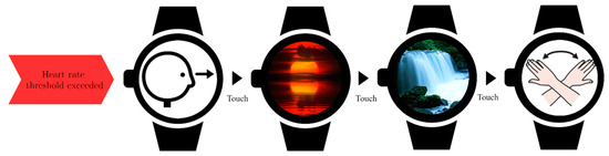 This system is called Taimun-Watch, and consists of a smartwatch-based application that aims to help individuals with ASD to learn emotional self-regulation strategies using the wearable sensors of heart rate to infer stress episodes (which some studies state to be a decent stress marker for these purposes [24]) and provide previously crafted instructions to regain calm. Educators create the sets of instructions, which are arranged into strategies and sent to the smartwatches via device synchronization. These strategies can be composed of images, animations, text and pictograms organized into sequences than can be navigated step-by-step by touching or swiping on the screen (see Figure 1). This data model has been designed in order to allow the implementation of most of the evidence-based practices about visual support on the literature [9,11,25,26], since these practices share a common formal structure, which can be summarized as “sequences of instructions composed of alternative and augmentative communication resources”. In this respect, we did not find relevant methodological differences regarding HFA compared to rest of the autism spectrum. Hence, we relied on the same kind of paradigm for intervention strategies and made no changes to the core functionality of the system.
