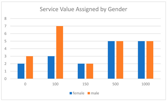 No significant difference was identified in the evaluation of the value of the service provided according to the gender of the robot F(1,37) = 0.33, p = 0.571, alpha = 0.05. The female service value perception was M = 623.47, SD = 314.30, while the male service value perception was M = 270.45, SD = 294.66 (see Figure 2).