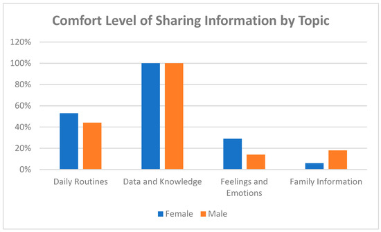 Finally, no significant differences were identified regarding the kind of information the participants felt comfortable sharing with the robot related to the gender (see Figure 3). However, there was a significant difference in the information that the participants felt comfortable sharing; “data and information” was the most common material that the participants were willing to share with the robot.
