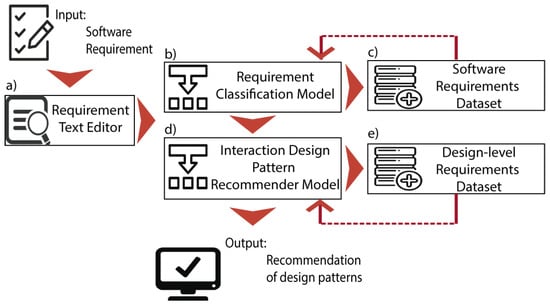 The requirement classification model module generates, as an output, a design pattern prediction. In this case, the example prediction is the “structured format” pattern, which is established as the following problem: “The user needs to enter data quickly in the system, but the format of the data must adhere to a predefined structure”. Furthermore, the model will be fed back with the prediction.