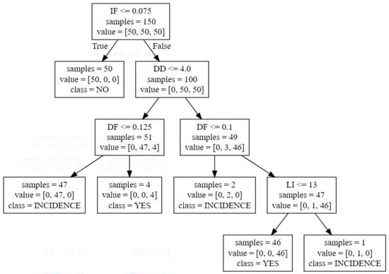 Finally, the classification algorithm used to get the output from the input set is the decision tree algorithm. Among the advantages of this algorithm over other algorithms such as the Nearest Neighbor algorithm or the Naive Bayes classifier is the speed of prediction as well as the amount of resources needed to predict the result. Figure 6 shows an example of how the decision tree algorithm works.