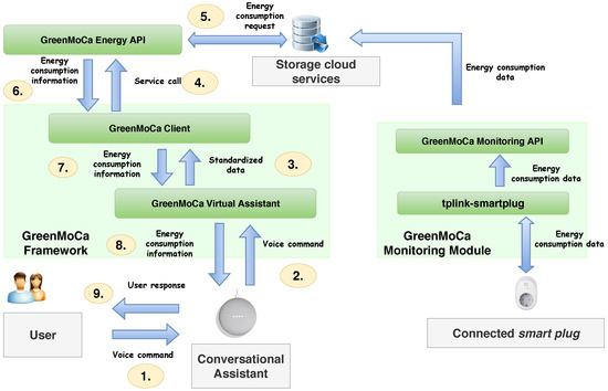 Furthermore, the widespread nature of the IoT concept leads to being aware of phenomena, such as climate change, which is a trend today. Thanks to IoT devices and advances in artificial intelligence field, cities, buildings, and households are becoming smarter, and one of the main issues is precisely the struggle associated with the sustainability of these environments in terms of energy. In this regard, energy monitoring systems have been developed in order to control, monitor, and optimize the energy consumption, for example, at home. These kinds of systems are known as Smart Home Energy Management Systems (SHEMS) [14], and they contribute to reducing the energy consumption by taking into account all devices connected to the power line. These connected devices (CDs) are usually appliances which use smart plugs to gather and send information about said appliance to a computer system. In this way, an user can figure out how much energy a CD is consuming (in real time), as well as switching on or off said device remotely, among other features. In addition, feedback from monitored data is essential to promote responsible energy consumption [15]. The usage of CAs as a bridge to control monitoring systems tries to reduce the interaction gap between users and their own systems which occurs mostly in a tangible and visual way and, at the same time, contribute significantly to a more sustainable use of energy at home [16].