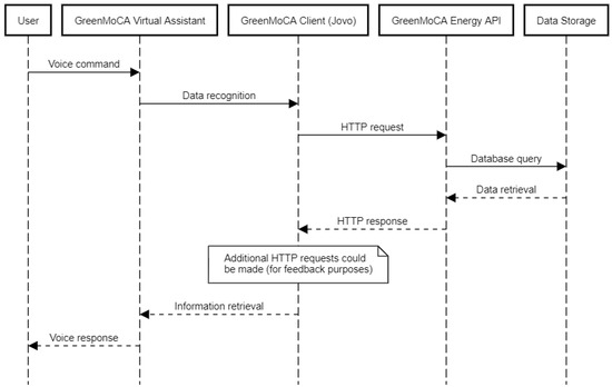 First, the user interacts with the CA, which receives the voice command and send this to the GreenMoCA Virtual Assistant. This component is in charge of standardizing the data before sending them to GreenMoCA Client. This component communicates with the corresponding services of GreenMoCA Energy API, according to the initial voice command. The result of this request is returned to the GreenMoCA Client, which will build the response to be sent to the GreenMoCA Virtual Assistant. Finally, this component sends the information to the CA, which communicates with the user by voice, providing an appropriate answer to the initial query. The communication between the user and the system is bidirectional, since all information along the elements of the system follows a “request-response” flow.