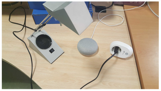 The tasks to be performed by the users include actions related to turn ON/OFF appliances and the monitoring of energy consumption at different time periods and home locations. For instance, task #1 consists of turning a lamp ON and OFF. As already illustrated in Figure 3, different training phases and entities that have been used are associated with every defined intent. For task #1, switching on the lamp, the intent is triggered by different requests (translated from Spanish), such as: (i) Could you turn on the lamp?, (ii) Turn on the lamp, (iii) Can you light the lamp?, etc. The requests are similar for the case of turning off the light. Figure 6 shows the setup used in task #1 during the evaluation experiment, where a desk lamp, the Google Home Mini, and the WiFi TP-Link HS110 smart plug can be observed on the table.