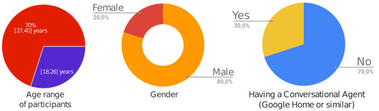 Ten users participated in the evaluation experiment. As illustrated in Figure 7, 70% of participants were in the range of 27 to 40 years old and the remaining 30% had ages between 18- and 26-years-old. In relation to the gender, 80% were men and the remaining 20% were women. Finally, to the question as to whether the user has a conversational agent similar to Google Home Mini at home, 70% answered NO, compared with 30% who answered affirmative.