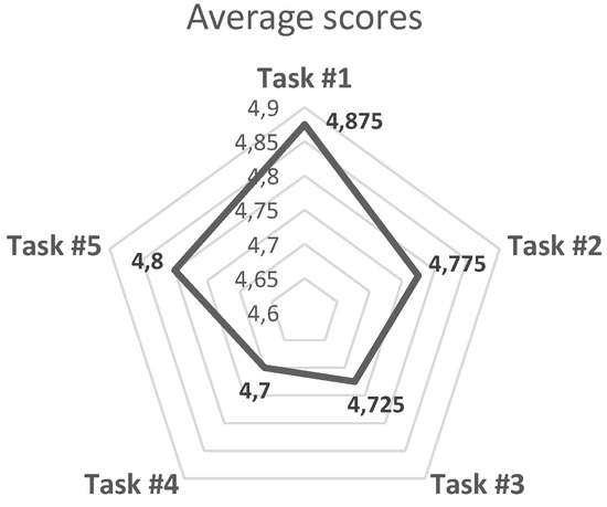 The radial chart in Figure 8 illustrates the final score for each task after averaging the numeric responses (Likert scale) for its set of questions and taking into account all the participants.