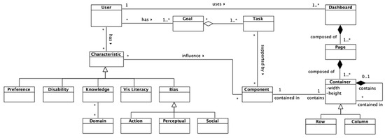 Introducing the user in the meta-model is essential, as their information goals are the backbone of the design processes. Characteristics including biases, literacy, preferences, disabilities, and so on, however, should also be considered to ensure that the dashboard is developed, taking into account different users’ dimensions that could influence their user experience. As has been shown, the users’ characteristics and goals were crucial to select appropriate visualizations and encodings. Future research lines will involve the refinement of the meta-model through the addition of constraints, rules, and design guidelines, seeking the support of the automatic generation of concrete dashboards.
