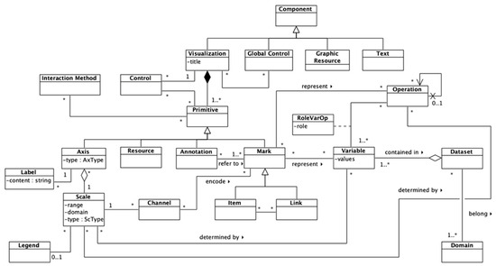 The meta-model supports the instantiation of fine-grained features regarding visualizations by distinguishing basic primitives that can be combined to build any type of chart. The meta-model structure makes possible any combination of marks, axes, annotations, resources, and so on, avoiding the necessity of relying on pre-defined charts, thus allowing more freedom when building custom visualizations for certain dashboards.