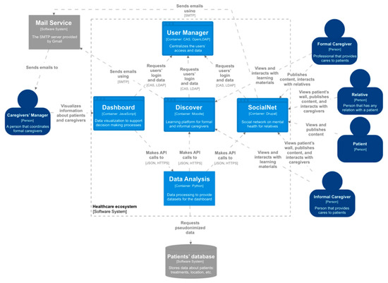 The healthcare dashboard is part of the technological ecosystem for caregivers, which is based on a meta-model defined and validated in previous works. The first version of the ecosystem meta-model is based on MOF, and the last validated version is an instance of Ecore [34]. Both versions are M2-models, and the model of the technological ecosystem for caregivers is an M1-model [12]. The model has served as a map to develop and deploy the ecosystem in a real context. The C4 model was used to represent the architecture of the final system. The C4 model was inspired by the UML and the 4+1 model for software architecture. It is a simplified version of the underlying concepts, designed to make it easier for software developers to describe and understand how a software system works and to minimize the gap between the software architecture description and the source code [35].