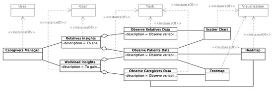 A series of goals have been extracted from the caregivers’ manager profile that will be addressed in this case study. Caregivers’ managers have a series of objectives regarding the analysis of the collected data. These requirements can be classified into two main goals: insights about the patients’ relatives and insights about the workload of the caregivers. The generated knowledge from the obtained insights can support decision-making regarding the distribution of caregivers to reduce workload and the impact of the patients’ relatives on their healthcare.