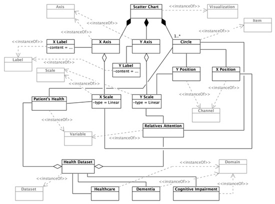Figure 4 shows the instantiation of the meta-model’s section that addresses the users’ goals. On the one hand, the first goal regarding relatives has the following description: “To analyze the relationship between the attention given by relatives and the patient’s health”. In this case, relatives (i.e., persons that have any kind of relationship with the patient) are the targets of the analysis. Two lower-level tasks arise to achieve that goal; that is, observe the relatives’ data and observe the patients’ data. Given the fact that the goal asks for “analyzing a relationship”, a dashboard component must support the mentioned tasks to enable managers to obtain insights. The selected component is a scatter chart that will be detailed later.