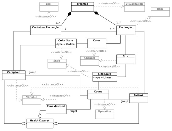The mentioned rectangles are enclosed within a container rectangle that represents each caregivers’ patients. The container rectangle is an instance of a Link mark, which allows encoding containment and connection relationships among visual items [39]. The instantiated treemap encodes the workload-by-patient of each caregiver, supporting managers in analyzing how to balance each caregiver’s workload without reducing patient care.