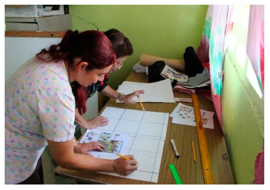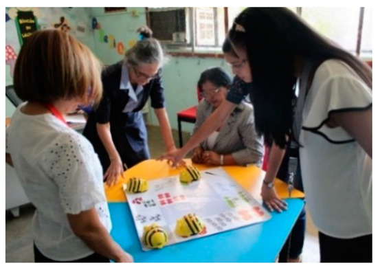 An important aspect that was considered for the successful development of the project was the training of the teachers who participated in the project. Figure 3 shows part of the training for teachers, where they are being instructed in the creation of rugs. He was also trained in the operation of Bee Bot as can be seen in Figure 4.