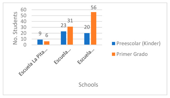 After the development of a set of activities in each of the schools participating in the project, an analysis of the results was carried out. Figure 6 shows how many students participated by school per academic level in the pre-test.