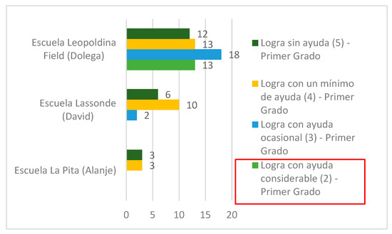 Other variables evaluated at this level were Robotics Resources, programming sequence and inquiry learning. The students in the three schools made use of «Bee-Bot» executing the programming sequences, learning by themselves to do them without help and with a minimum of help, performing the challenges adequately. However, there are children who find it difficult to use the robot with considerable help reflected in the school Leopoldina Field are 13 students who are under this condition, marked in a red box (see Figure 10).