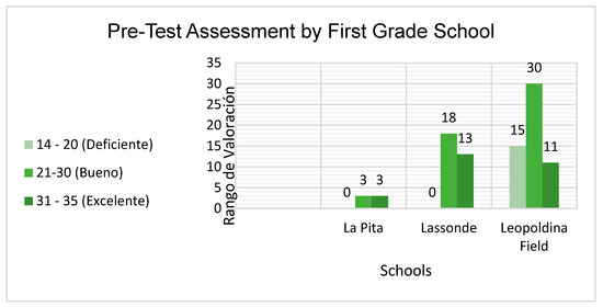 Making a global analysis after having applied the pre-test in the Lassonde and La Pita Schools, the students did not show significant deficiency in their learning in the implementation of the project. However, 13 students of the Leopoldina Field School obtained a poor evaluation, this means that the student was becoming familiar with the use of “Bee-Bot” so it was difficult for him to perform the instructions that were indicated. In addition, the three schools remained in a rating range such as: good and excellent (see Figure 11).