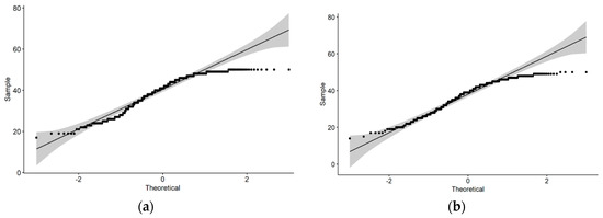 Each answer was considered individually (“How good were the answers?” and “How correct were the answers?”) and then grouped. To group the results, the ten scores from a single participant were added. This provides an aggregated score with a minimum value of 10 and a maximum of 50 per participant. Normality tests were conducted, and the data did not show a normal distribution.