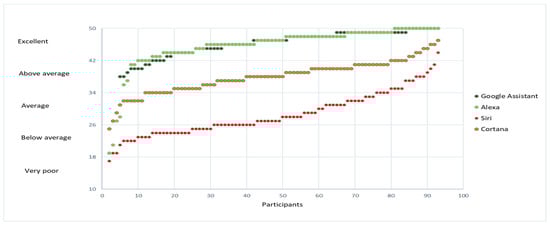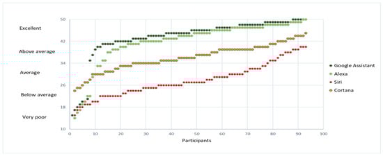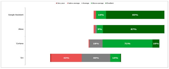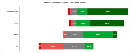 Figure 4 shows a comparison of the sum of the responses of the participants separating each assistant to compare based on “How correct were the answers?”. The superiority of both Google Assistant and Alexa is also apparent in this figure.