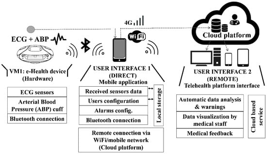 The paper is organized as follows. First, existing technologies are presented and compared to our device, the VM1. Then, in Section 3, an overview of the overall telemedicine system architecture is described, followed by a deep and detailed description of the VM1, a summary of the companion smartphone app, and an overview of the remote e-health platform. Section 4 presents some results from real ECGs that were directly obtained from the VM1 and compared side-by-side with simultaneous ECG recordings obtained using a medical-grade system. The last section is devoted to the presentation of the main conclusions of this and future work.