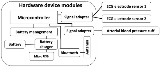 The VM1 was designed to be highly ergonomic and easy to use, so that any cardiac patient (including older people) could use it without assistance. The VM1 includes a portable blood pressure cuff, an air compressor, two ECG electrodes, and other hardware elements (see Figure 2), specifically a battery, a Bluetooth communication module, and a processor, which orchestrates the rest of the system elements and the communication with the mobile application. This app stores the data of the VM1 measurements, and controls the VM1 itself through the Bluetooth communication interface.