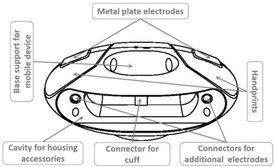 The VM1 design includes a large cavity in the middle part of the structure, under the smartphone holder. This cavity has been designed to house some additional measurement elements, that include additional connectors to two optional wired electrodes and their cables for direct skin contact, as well as the cuff for blood pressure measurement.